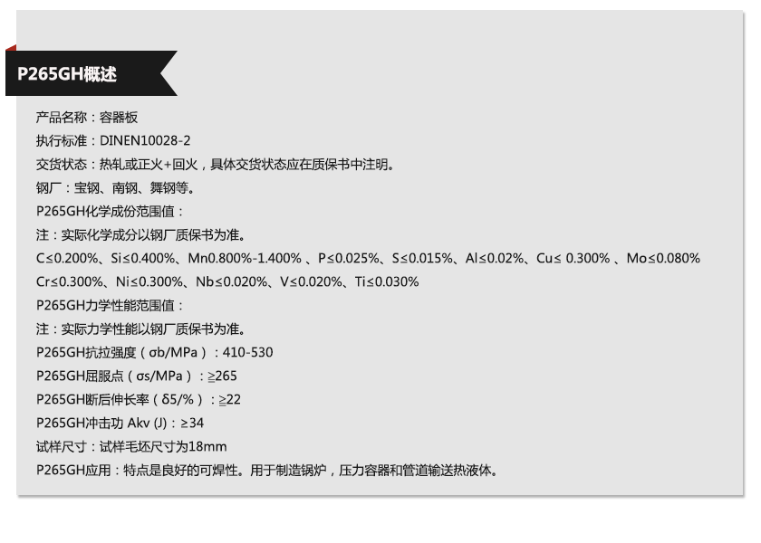 P265GH板材可分别称为P265GH合金钢板、P265GH钢板、P265GH卷板、P265GH开平板、P265GH带钢、P265GH冷轧板、P265GH热轧板、P265GH薄板、P265GH中板、P265GH厚板、P265GH特厚板等。
