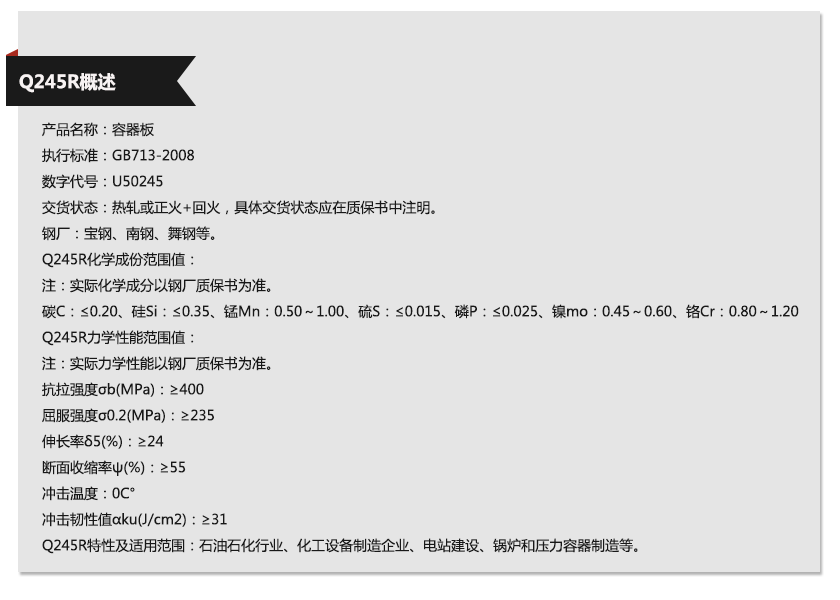 Q245R板材可分别称为Q245R合金钢板、Q245R钢板、Q245R卷板、Q245R开平板、Q245R带钢、Q245R冷轧板、Q245R热轧板、Q245R薄板、Q245R中板、Q245R厚板、Q245R特厚板等。